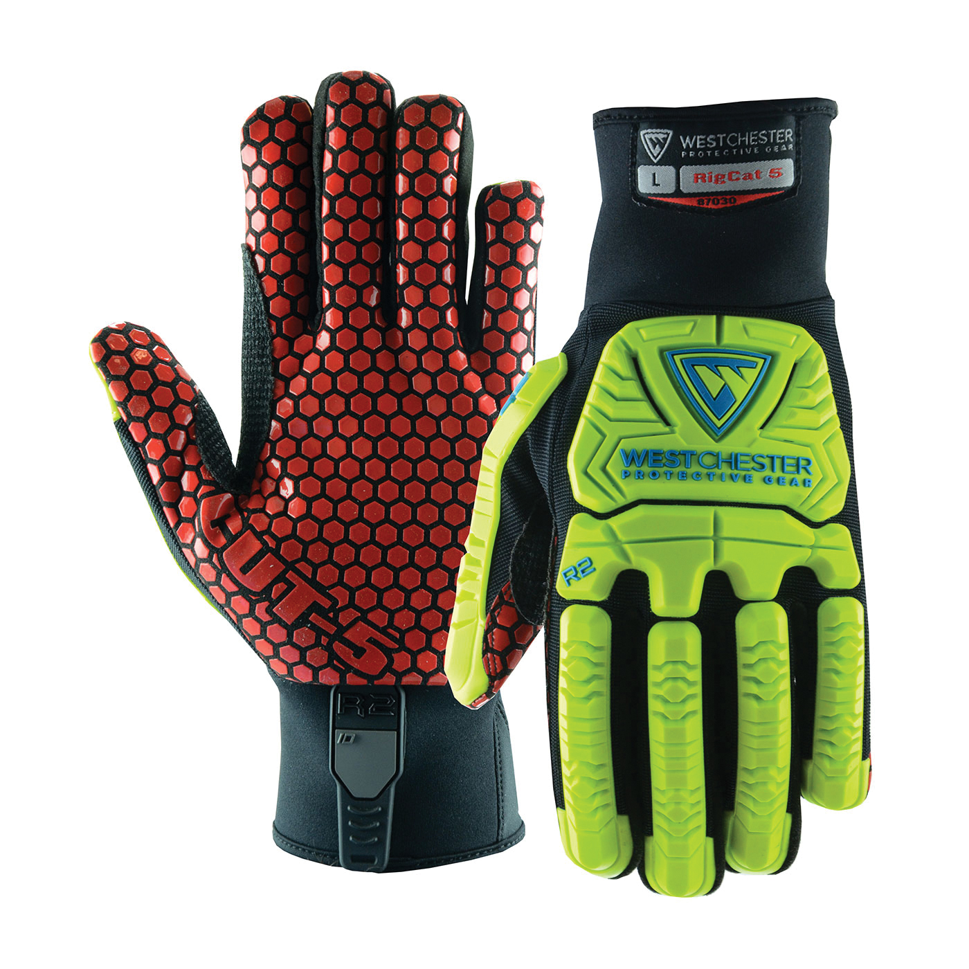 PIP Rugged Rigger 87030/L Unisex General Purpose Gloves Coated/Work Wing Thumb Style L Synthetic Leather/Silicone Palm Synthetic Leather/Spandex Black/Blue/Red/H-Viz Yellow Band Top Cuff Silicone Coating Resists: Cut and Impact