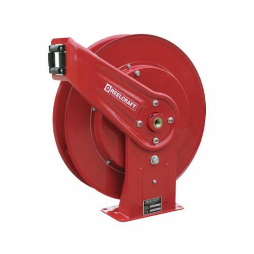 - Color:RedDimensions:20-1/4 in H x 7 in W x 19-3/4 in DDomestic/Import:DomesticDrive Type:Retractable SpringFinish:Powder CoatedHose Capacity:1/2 in ID x 3/4 in OD x 50 ft LMaterial:Reinforced Stainless SteelMounting Type:Bench/Ceiling/Floor/Truck/WallPressure Rating:500 psiReel Diameter:19-3/4 inReel Width:3-7/8 inSeal Type:Aflas®Series:7000Swivel Material:Nickel Plated SteelType:Heavy Duty Low Pressure