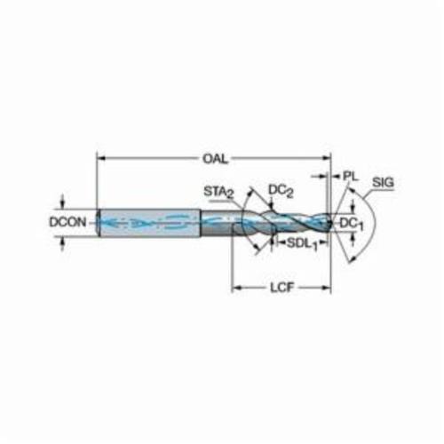 Sandvik Coromant Step and Chamfer Drill, High Performance Versatile, Series: CoroDrill® 460, Imperial, 0.266 in Diameter Minimum Hole, 0.359 in Diameter Maximum Hole, 3.504 in Overall Length, 2 Steps, 0.74 in Step Depth, 2 Hole, 2 Flutes, SSK Flute, 1.417 in Flute Length, 0.3937 x 1.5748 in Shank, Cylindrical Shank, 140 deg Point, Right Hand Cutting Direction, Solid Carbide Cutting Edge, Solid Carbide