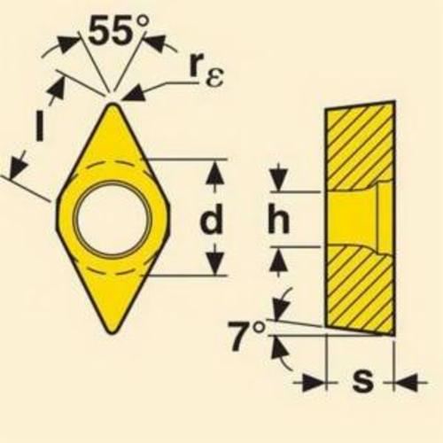 - ANSI Code:DCMT32.51-F1 CP200Chipbreaker:F1Corner Radius:0.4 mmCutting Direction:NeutralFinish:PVD-TiAlN+TiN CoatedFor Use On:Stainless Steel and Titanium/Super AlloysHole Diameter:4.5 mmIncluded Angle:55 degInscribed Circle:9.5 mmInsert Size:11T304Insert Style:DCMTISO Code:DCMT11T304-F1 CP200Manufacturer's Grade:CP200Material:CarbideMaterial Grade:M, SMaximum Depth of Cut:3.75 mmRake:PositiveRelief Angle:7 degSeat Size:11Shape:DiamondThickness:3.97 mm