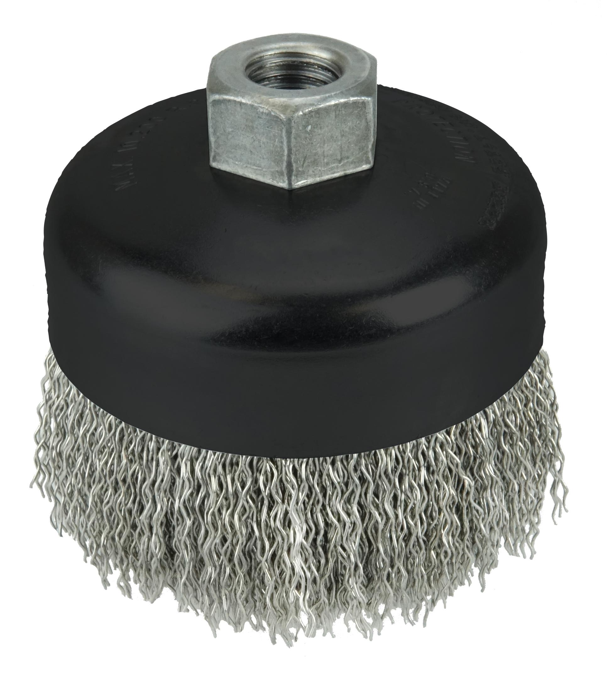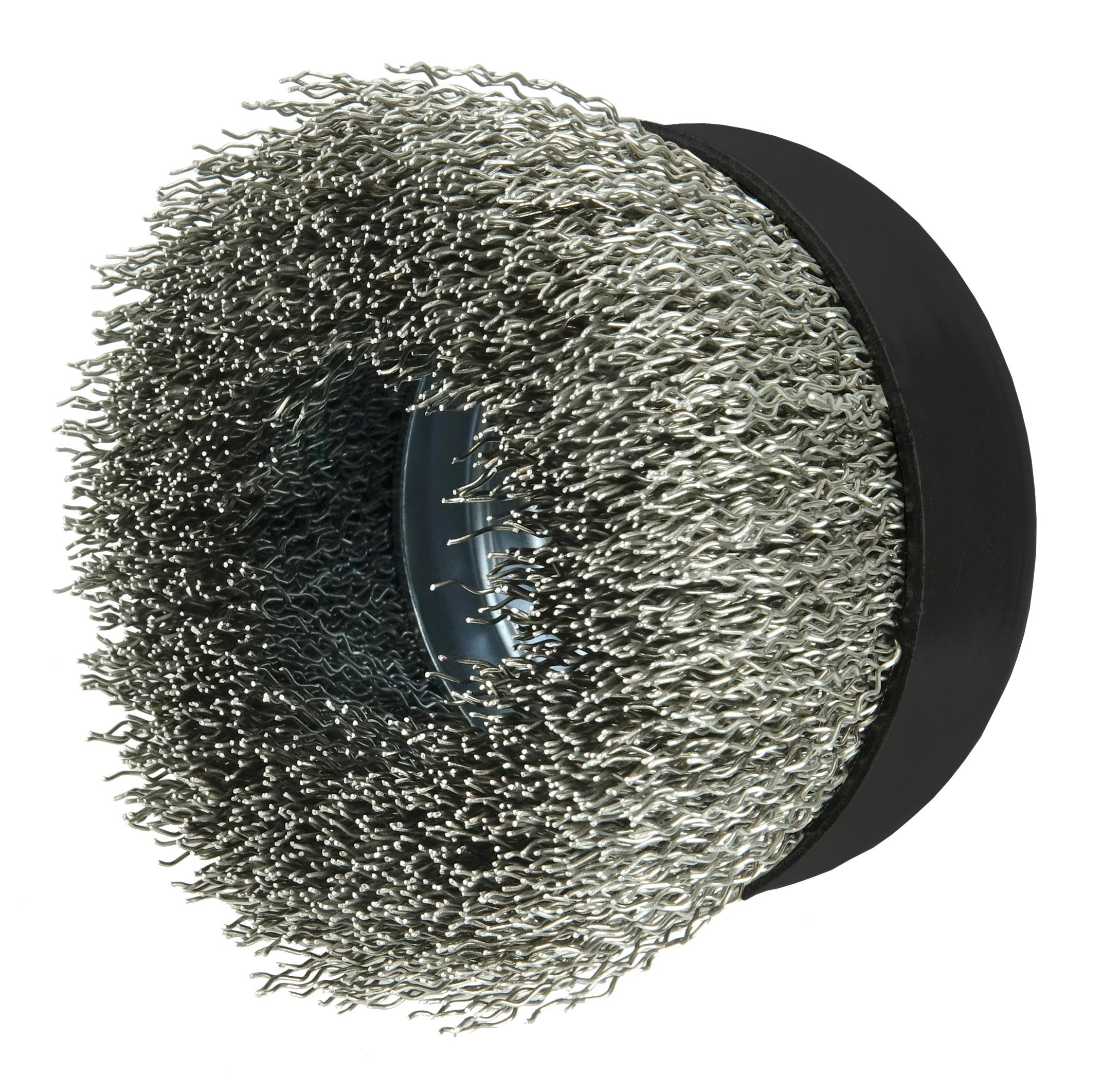 Weiler 14126 Cup Brush, 4 in Dia Brush, 5/8-11 UNC Arbor Hole, 0.02 in Dia Filament/Wire, Crimped, Stainless Steel Fill